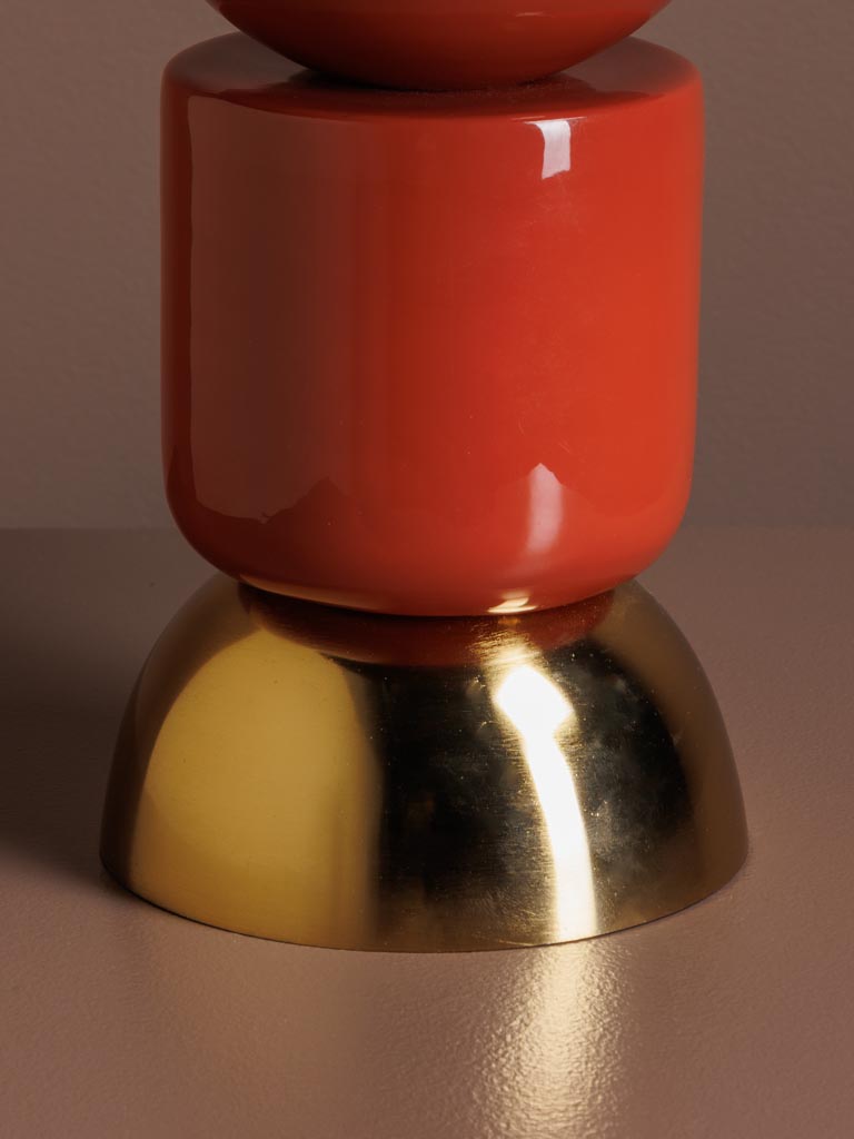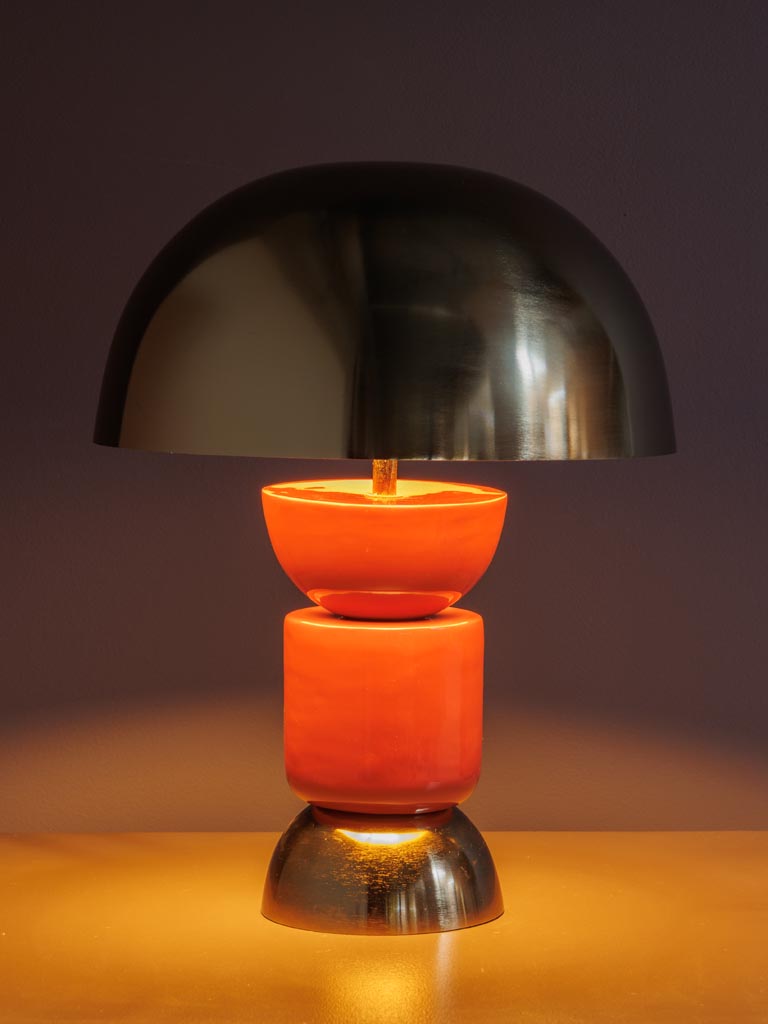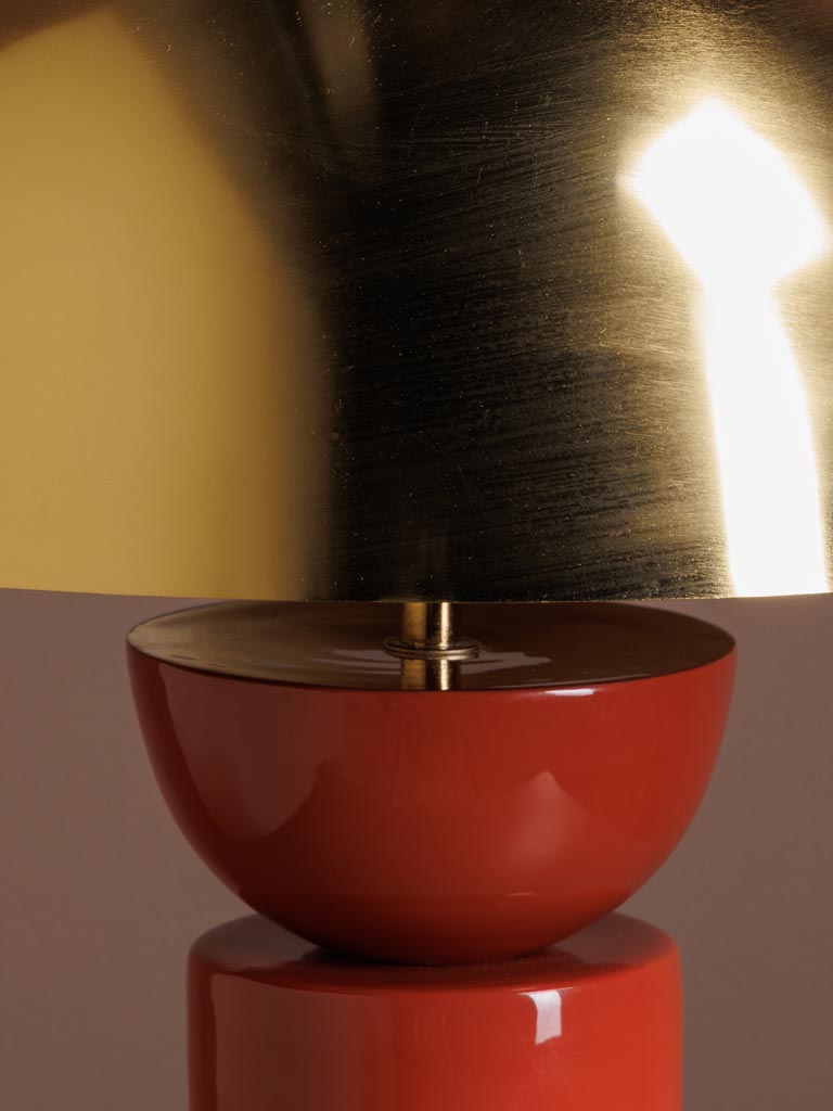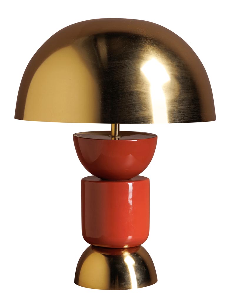 Apportez une touche design et chaleureuse à votre intérieur avec cette lampe champignon moderne. Son pied composé de trois blocs en métal terracotta et doré lui donne une silhouette originale et contemporaine, tandis que son abat-jour doré diffuse une lumière douce et élégante.