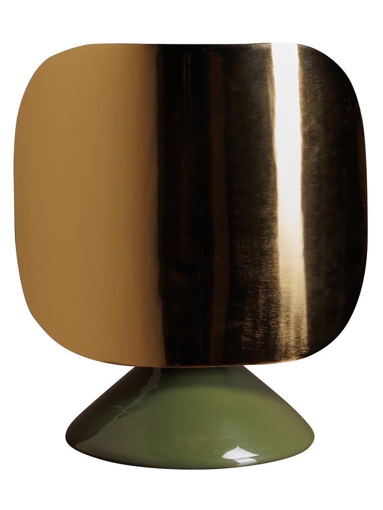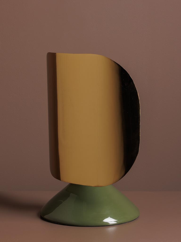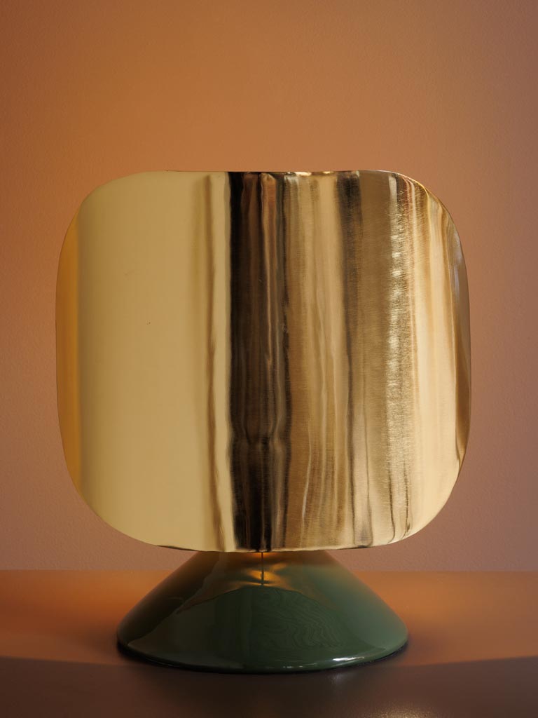 Apportez une touche contemporaine et élégante à votre intérieur avec cette lampe moderne au design sculptural. Son pied en métal vert affirme son caractère, tandis que son abat-jour en métal doré diffuse la lumière avec douceur et crée un effet visuel raffiné.