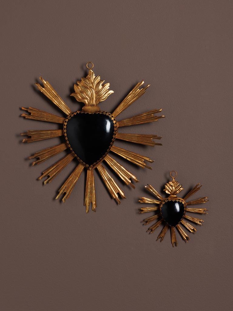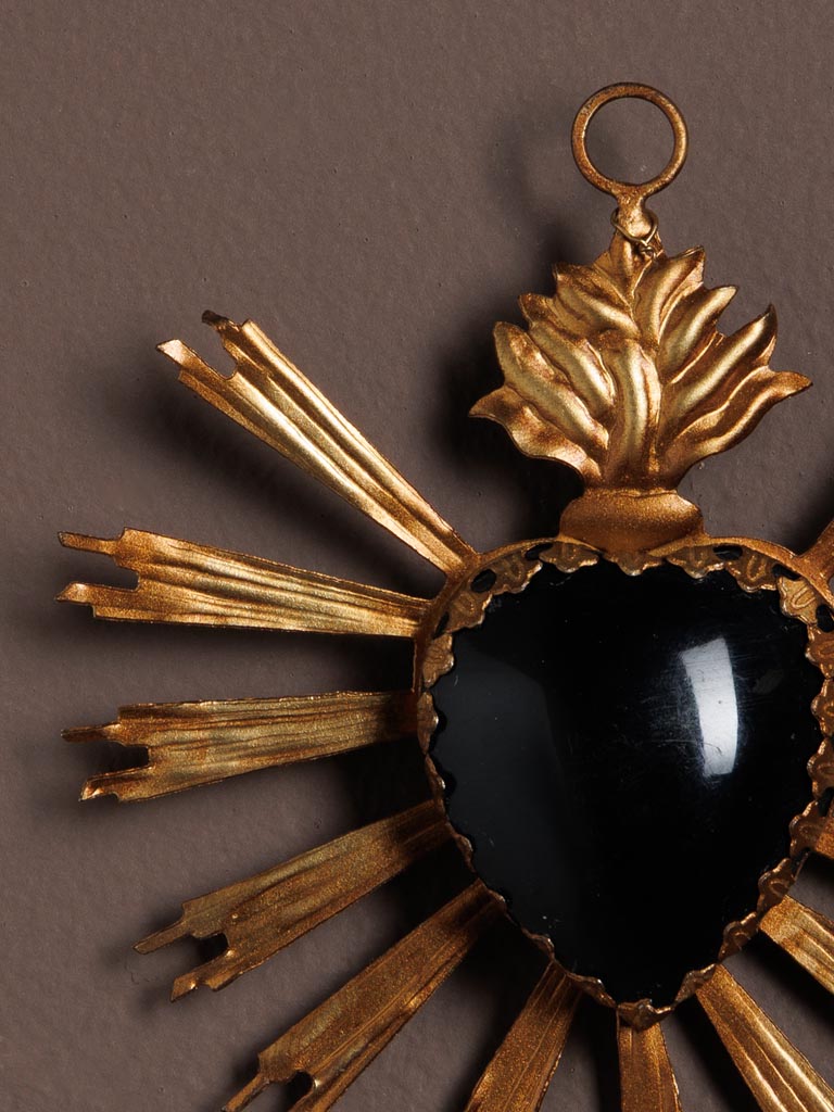 Apportez une touche symbolique et raffinée à votre décoration avec ce petit ex-voto cœur noir et doré. Son contraste entre le noir profond et les détails dorés lumineux lui confère un style à la fois élégant et affirmé.
