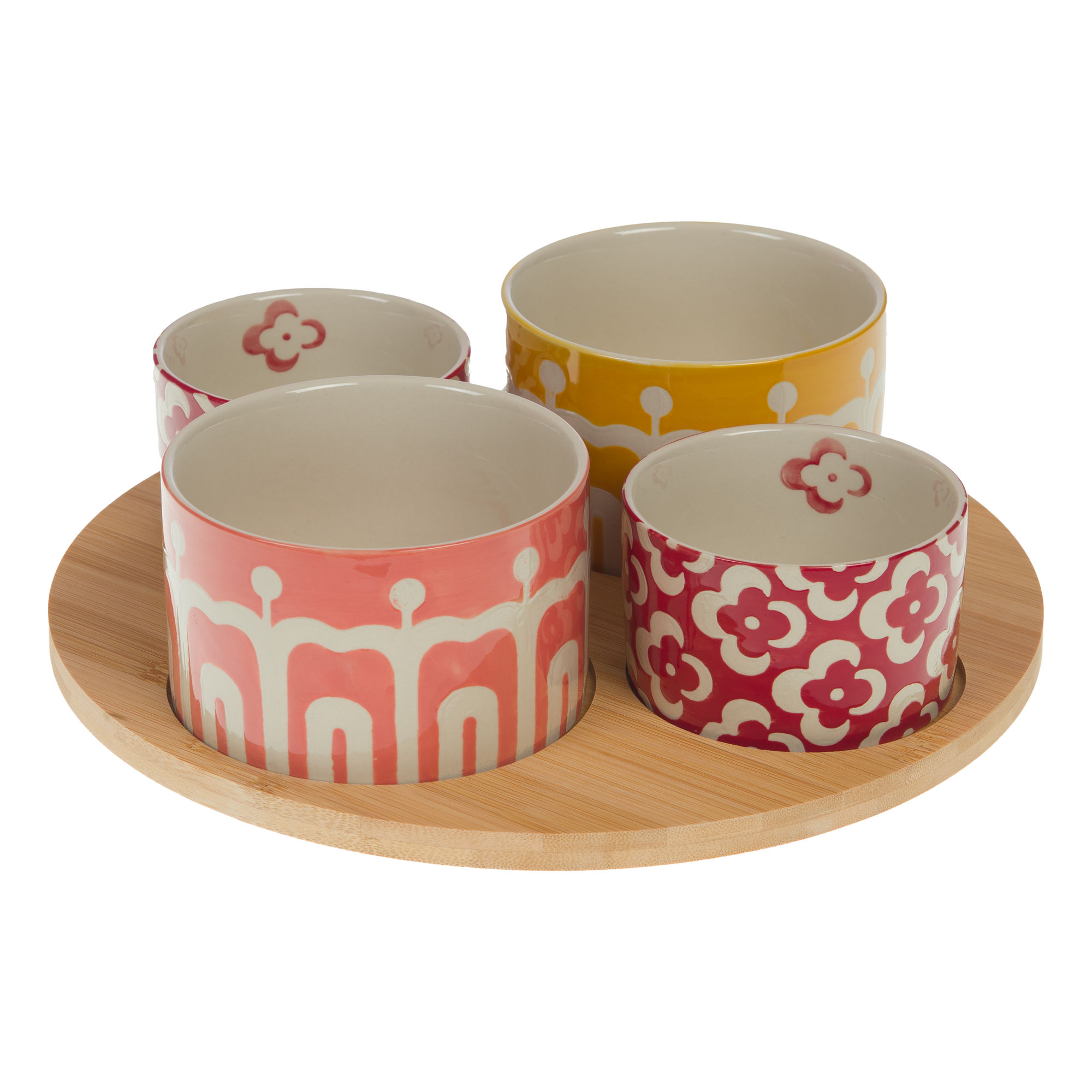 Apportez couleur et convivialité à vos apéritifs avec ce set Debbie : un plateau en bois naturel accompagné de 4 bols en grès aux motifs joyeux et colorés. Parfait pour partager tapas, dips ou petites gourmandises, il crée une ambiance chaleureuse et festive à chaque occasion.