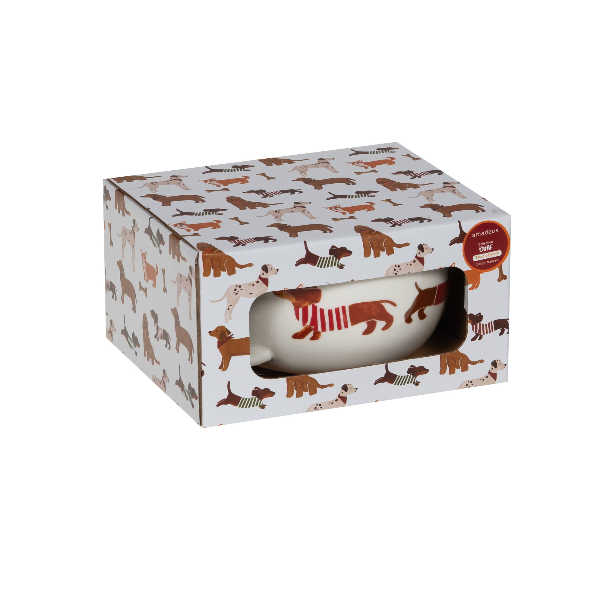 Apportez une touche de fantaisie à vos matinées avec cette grande tasse déjeuner « ouaf ». Sa anse confortable, sa contenance généreuse et son décor joyeux de petits chiens en font le compagnon idéal pour café, soupe ou céréales. Robuste et facile à intégrer dans une cuisine conviviale, elle mettra le sourire à table.
