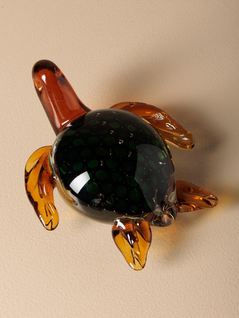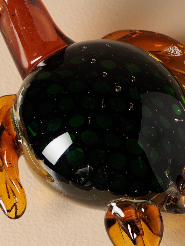 Tortue verte et ambre en verre à poser sur une meuble ou sur servant de presse papier sur un bureau.